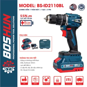 Máy Khoan Pin 3 Chức Năng Boshun BS-ID2110BL , Lực Xoắn 55Nm , Motor Không Chổi Than – Móc Cài Kim Loại – 2 Pin 5Cell